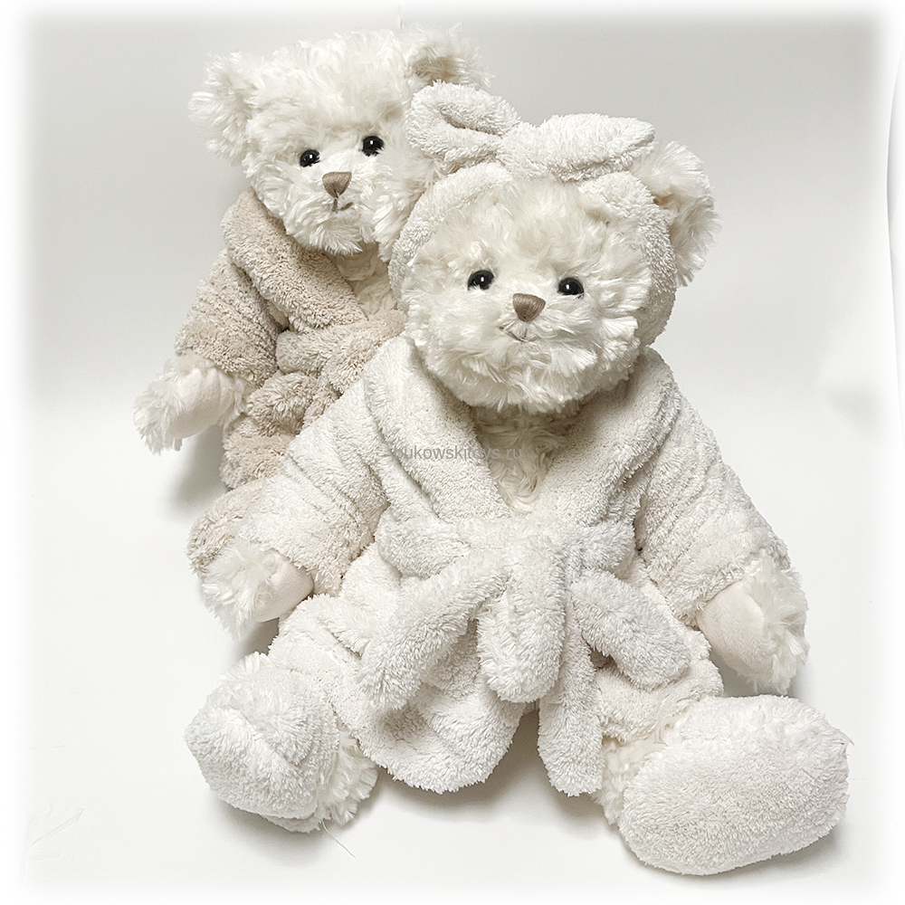Большой белый мишка в пушистом банном халате, после упаковки нуждается в расчесывании или встряхивании, чтобы распрямить примятый упаковкой мех