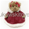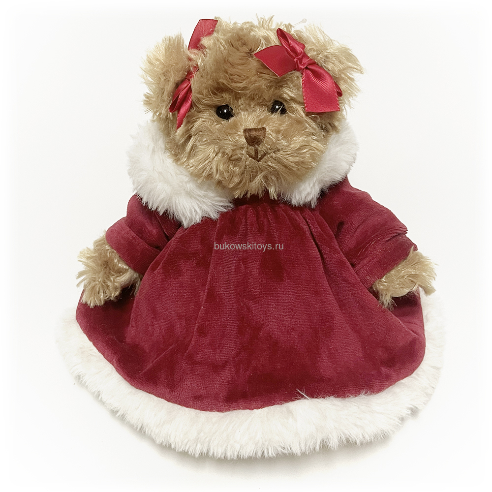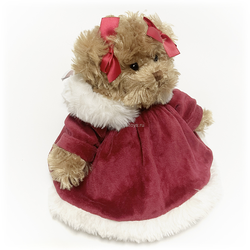 Милый коричневый мишка-девочка среднего размера в ярком плюшевом платье, после упаковки игрушка нуждается в встряхивании или в расчесывании