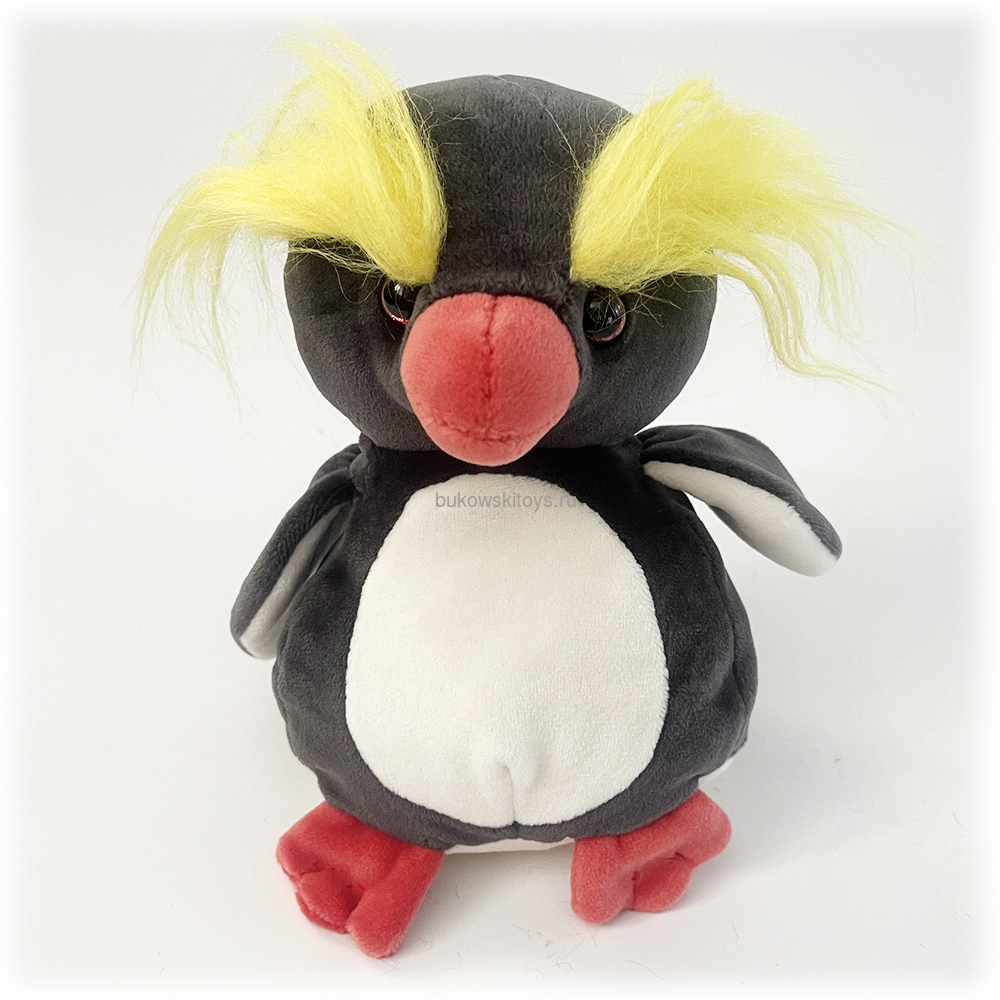 Небольшой плюшевый пингвин с вышитыми глазками и густыми желтыми грозными бровями безопасен для всех любителей игрушек Барбары Буковски